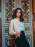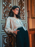 Ivory-colored fluid jacquard shirt with jewel button. Musketeer sleeves, fitted cuffs, jewel buttons, V-neck.