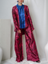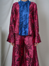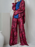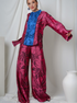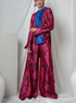 Wide leg trousers with a front zip closure, combining electric blue at the waist and strawberry pink. Wear them with our tailcoat-style shirt in the same tones.