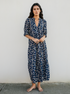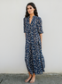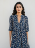 Vestido de estilo bohemio con un diseño fluido y estampado floral en tonos azul marino. Tiene un cuello en V con detalle de bordado que resalta la zona del escote. Las mangas son de largo medio y ligeramente abullonadas, aportando un aire romántico y femenino. Su corte suelto y ligero lo hace una opción cómoda y versátil, ideal para un look casual chic.