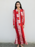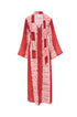 Vestido Caftán, con un diseño elegante y moderno. Estampado Tye Dye en tonos rojos y rosados. De mangas largas y escote en "V" con una lazada que puedes quitar o poner para dar un toque sofisticado. Su corte fluido y holgado realza la silueta, con un aire relajado pero chic.