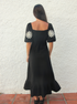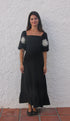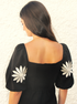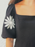 Vestido de lino negro de manga corta con escote cuadrado y manga abullonada con margaritas bordadas. La parte de le espalda es elástica y se adapta perfectamente al pecho haciendo la silueta es ajustada en la parte superior y se va soltando hacia abajo, terminando en un pequeño volante. El estilo del vestido es femenino, elegante y sencillo, adecuado tanto para un paseo casual como para una ocasión semi-formal.