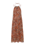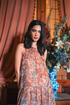 Un vestido de gasa muy veraniego para cualquier ocasión, dependiendo de los accesorios. En tono anaranjado, con unas pinceladas de brillo en el tejido. Muy fluido y ligero.