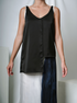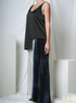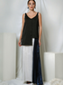 Long pleated dress made of 3 fabrics and 3 different colours: black, white and blue, with geometric cuts and 3 different textures (satin crepe, organza and chiffon crepe). You will not go unnoticed with this very special piece.